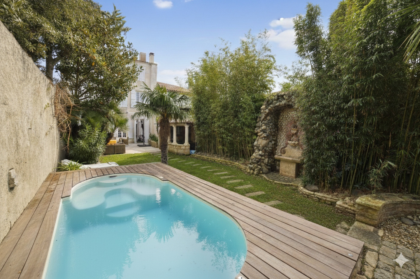 Outside, the Bastide has a large west-facing terrace that will allow you to enjoy sunny moments of relaxation, as well as a beautifully wooded garden that offers, the ultimate luxury, the only swimming spot on the islet: a heated 3.50m swimming spa.