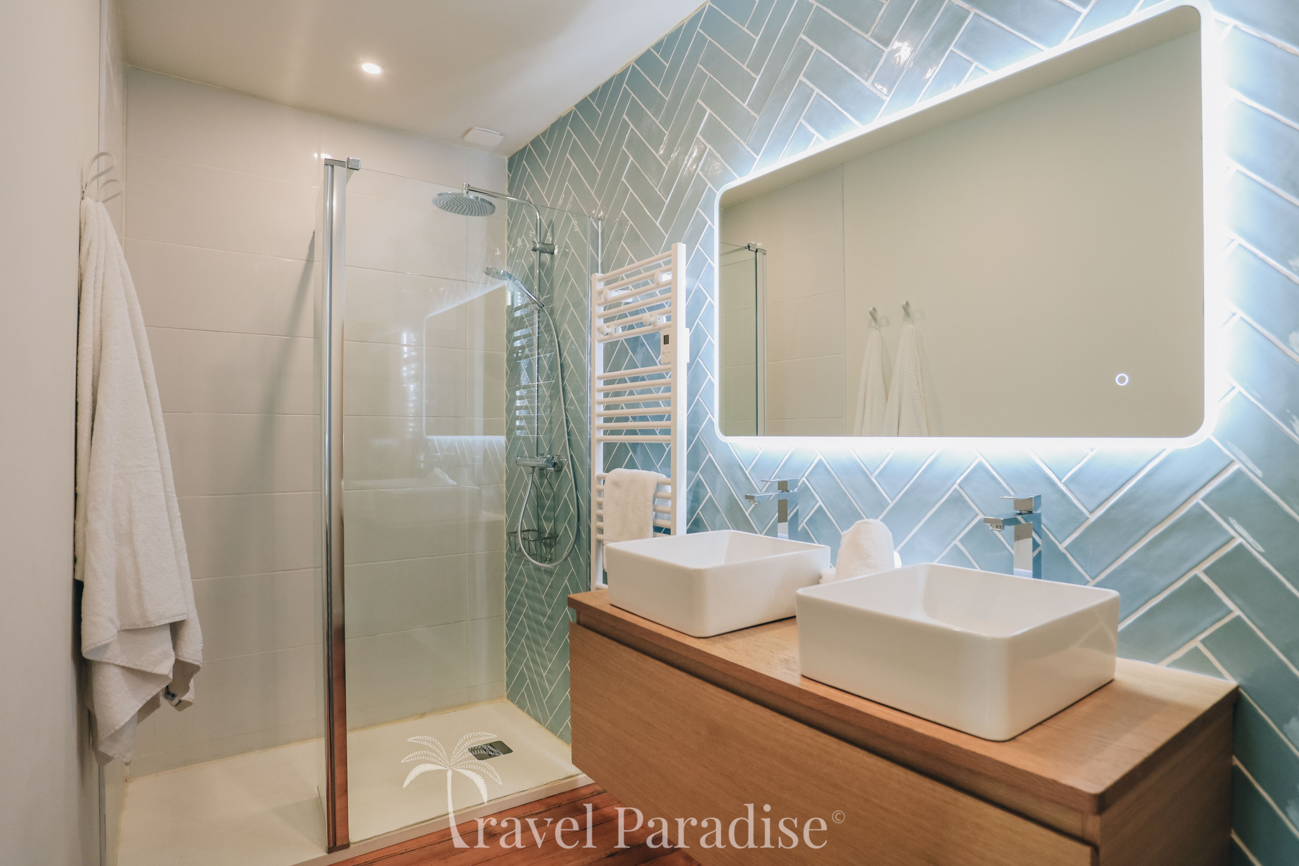 Upon your arrival, you will be charmed by the vast living space on the ground floor, which includes a living room and dining room with a terracotta floor opening onto the exterior and the spa. The villa can easily accommodate up to 12 people, with its 4 bedrooms located on the first floor. Each has its own bathroom, with the exception of a shared bathroom.