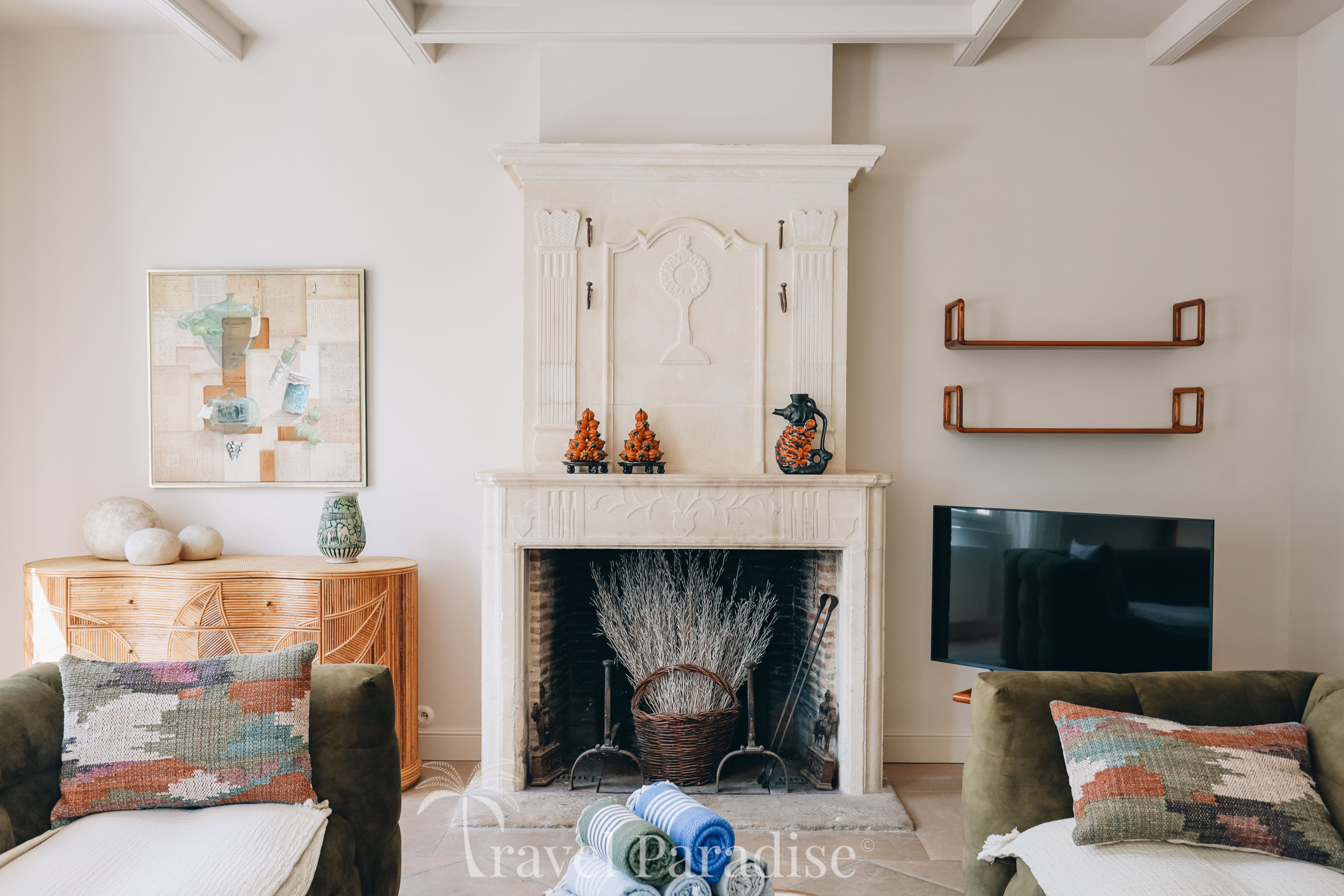L’intérieur, chaleureux et décoré avec goût, se distingue par ses poutres apparentes, son ambiance cosy et ses volumes généreux.