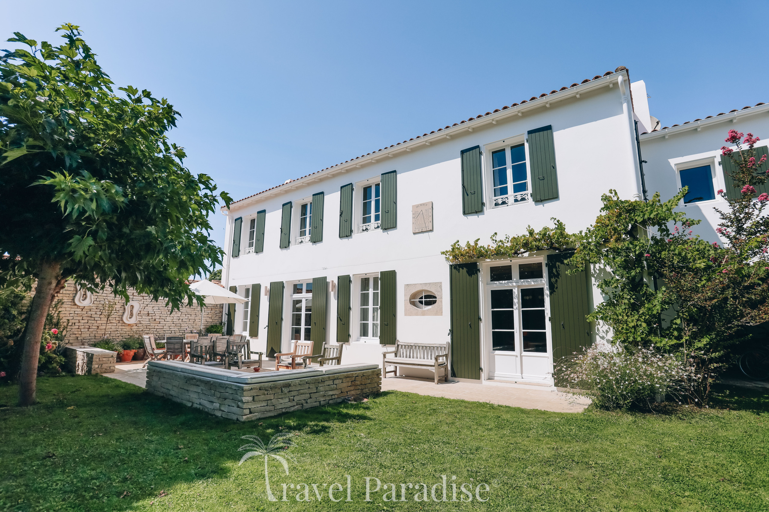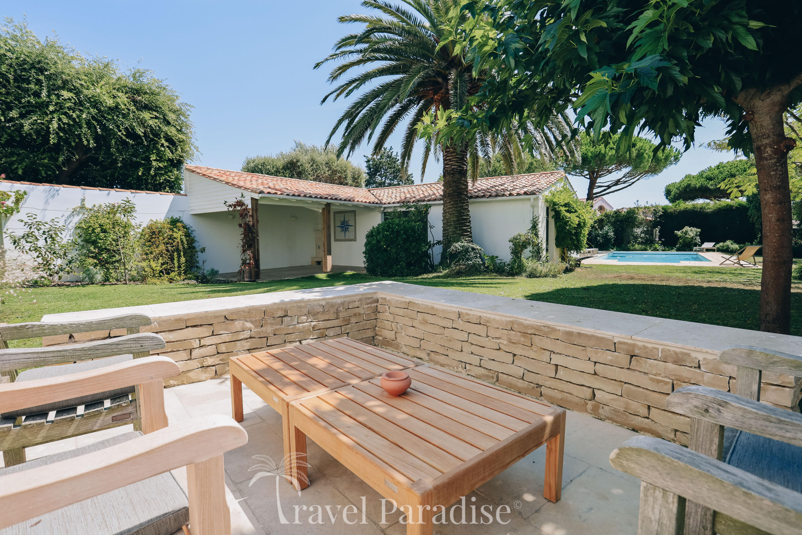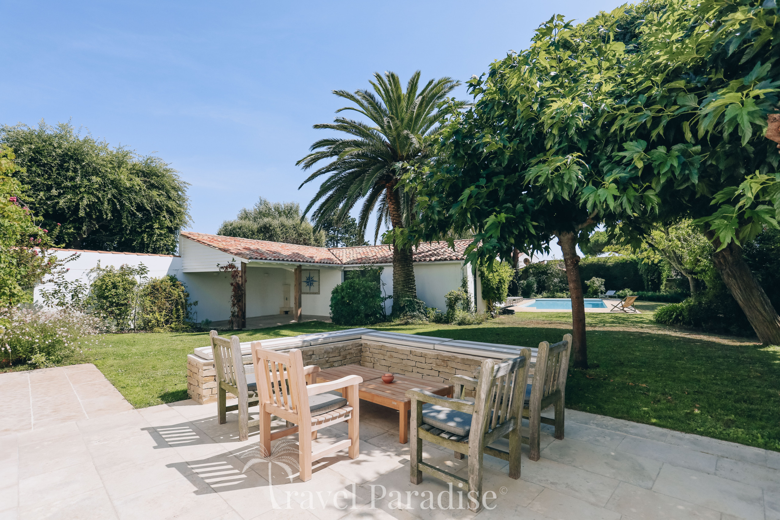 À l’extérieur, la villa a été pensée pour profiter pleinement de la douceur de vivre rétaise :