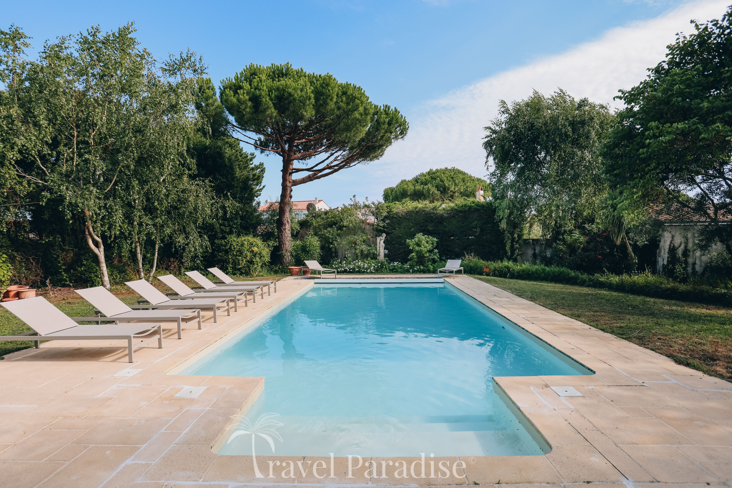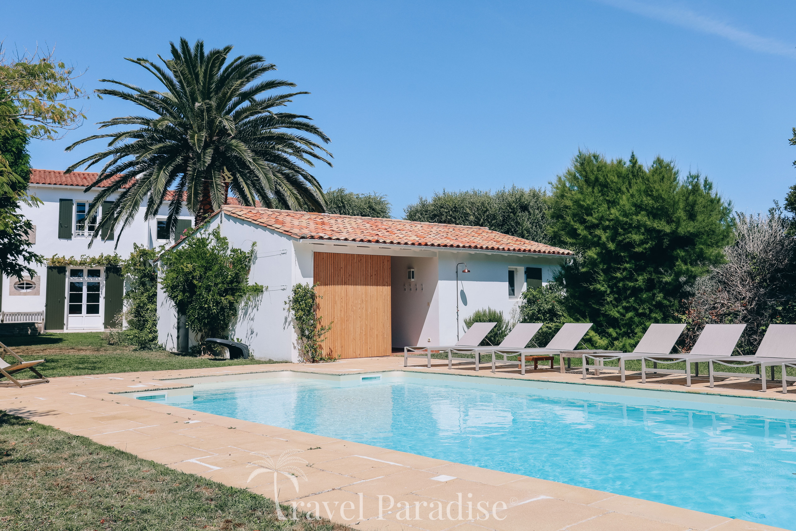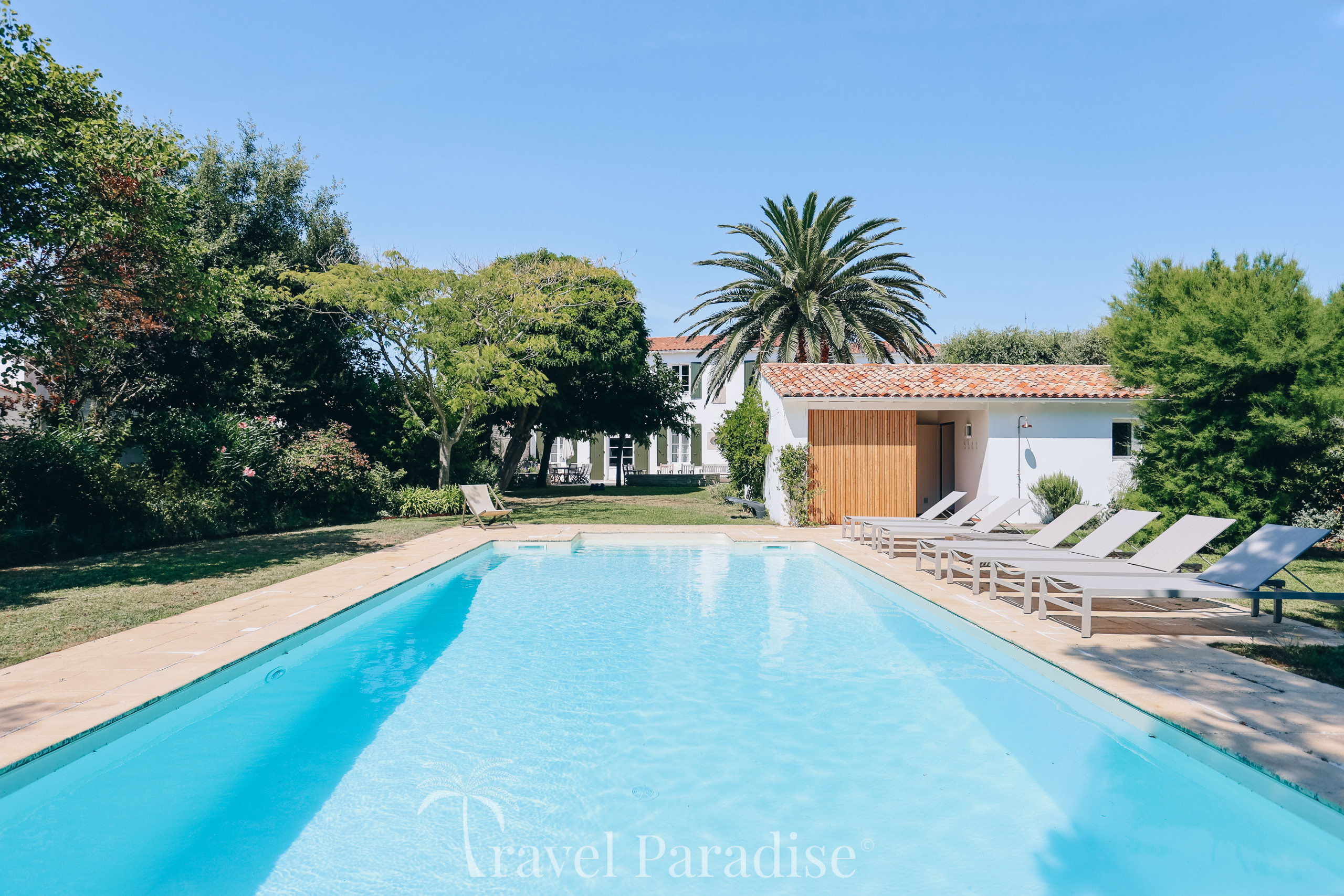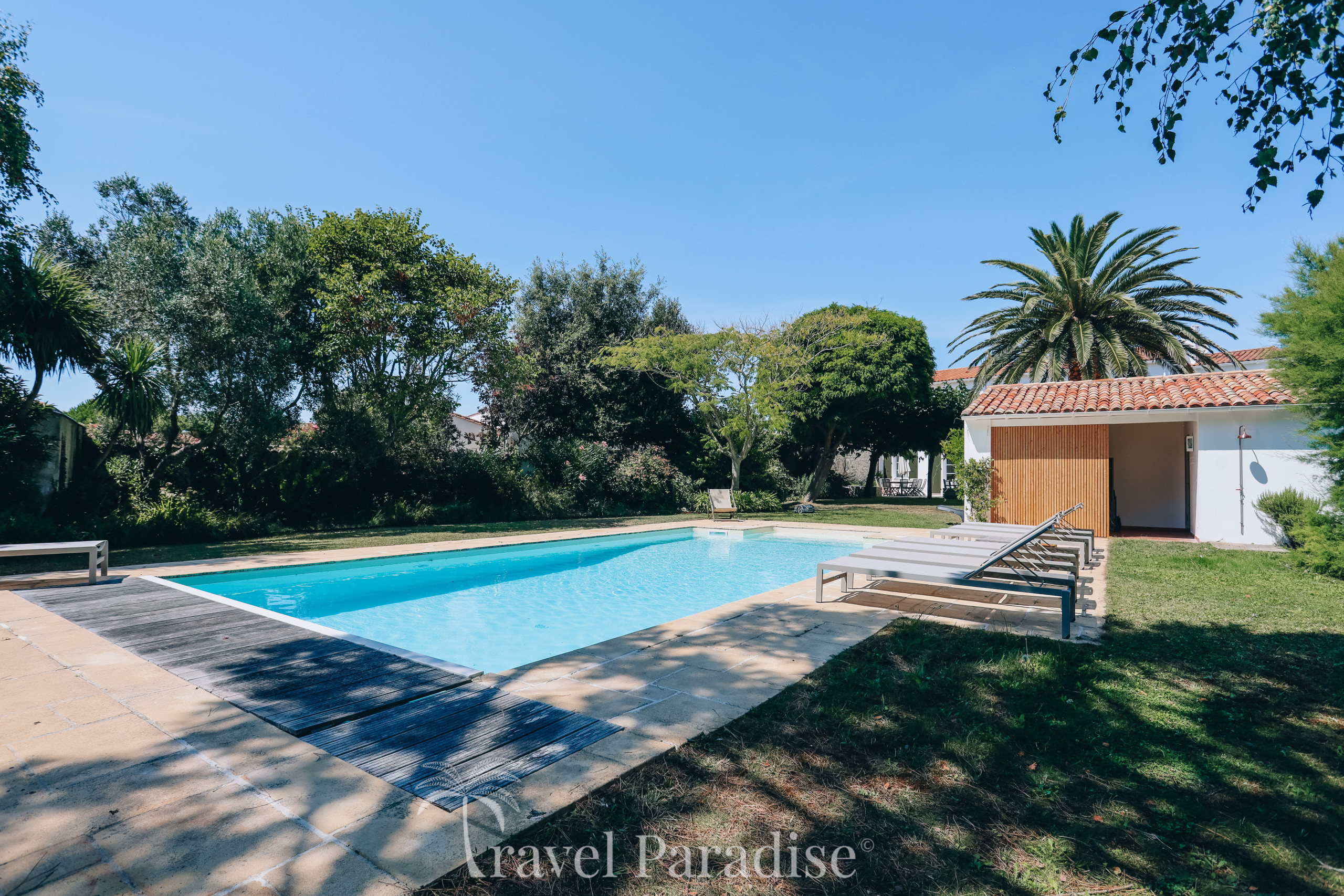 La propriété dispose d’une grande piscine chauffée, entourée d’un vaste jardin paysager qui invite à la détente sous le soleil rétais.