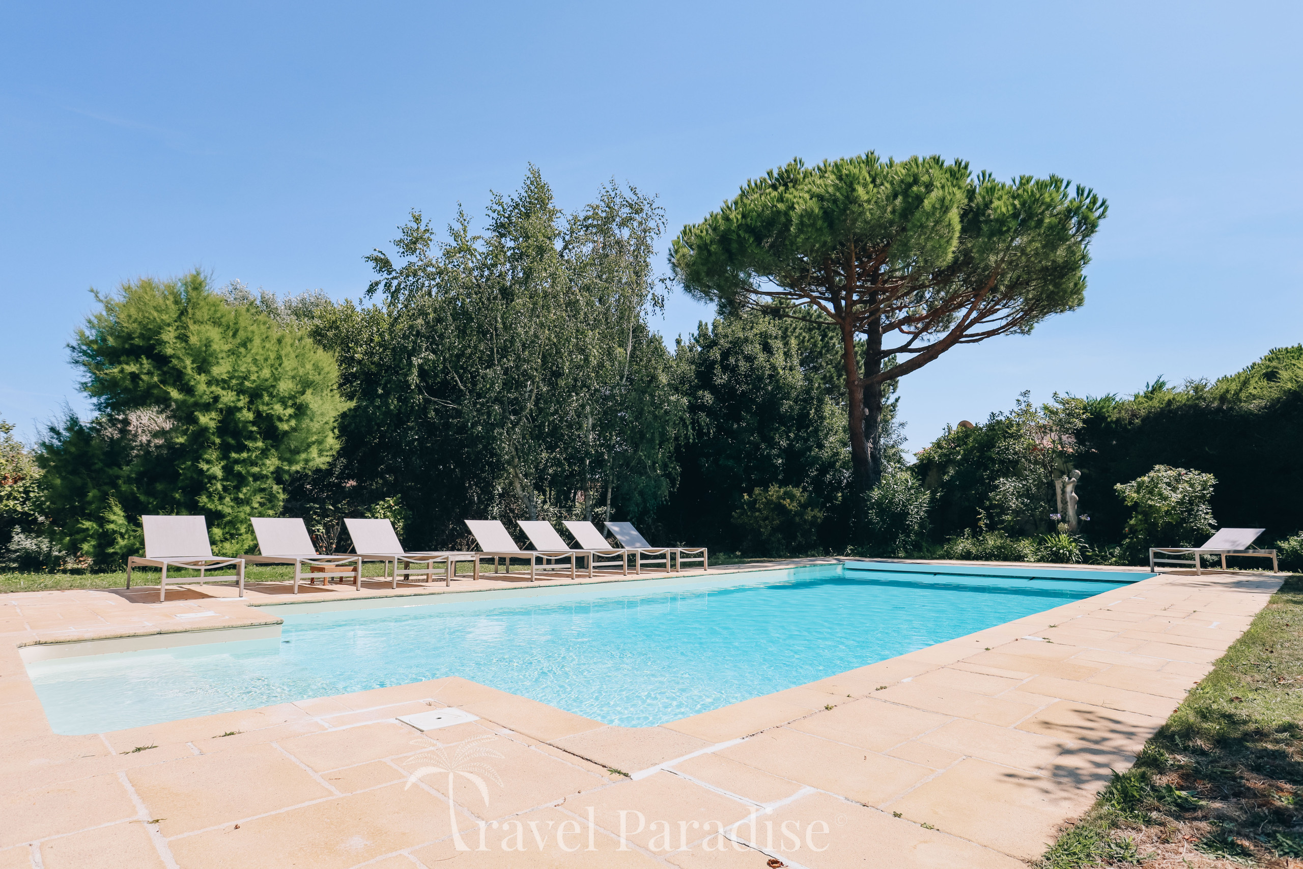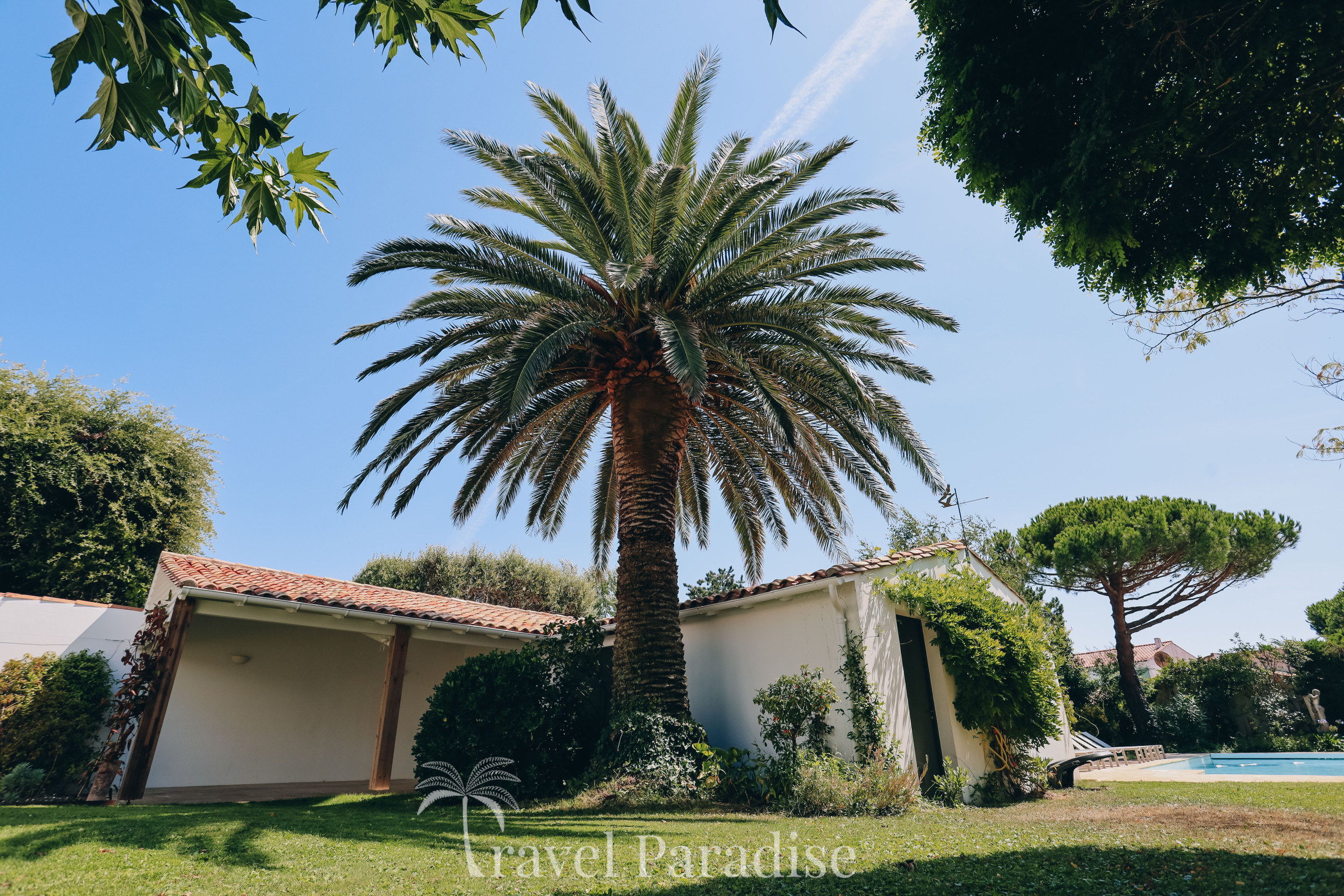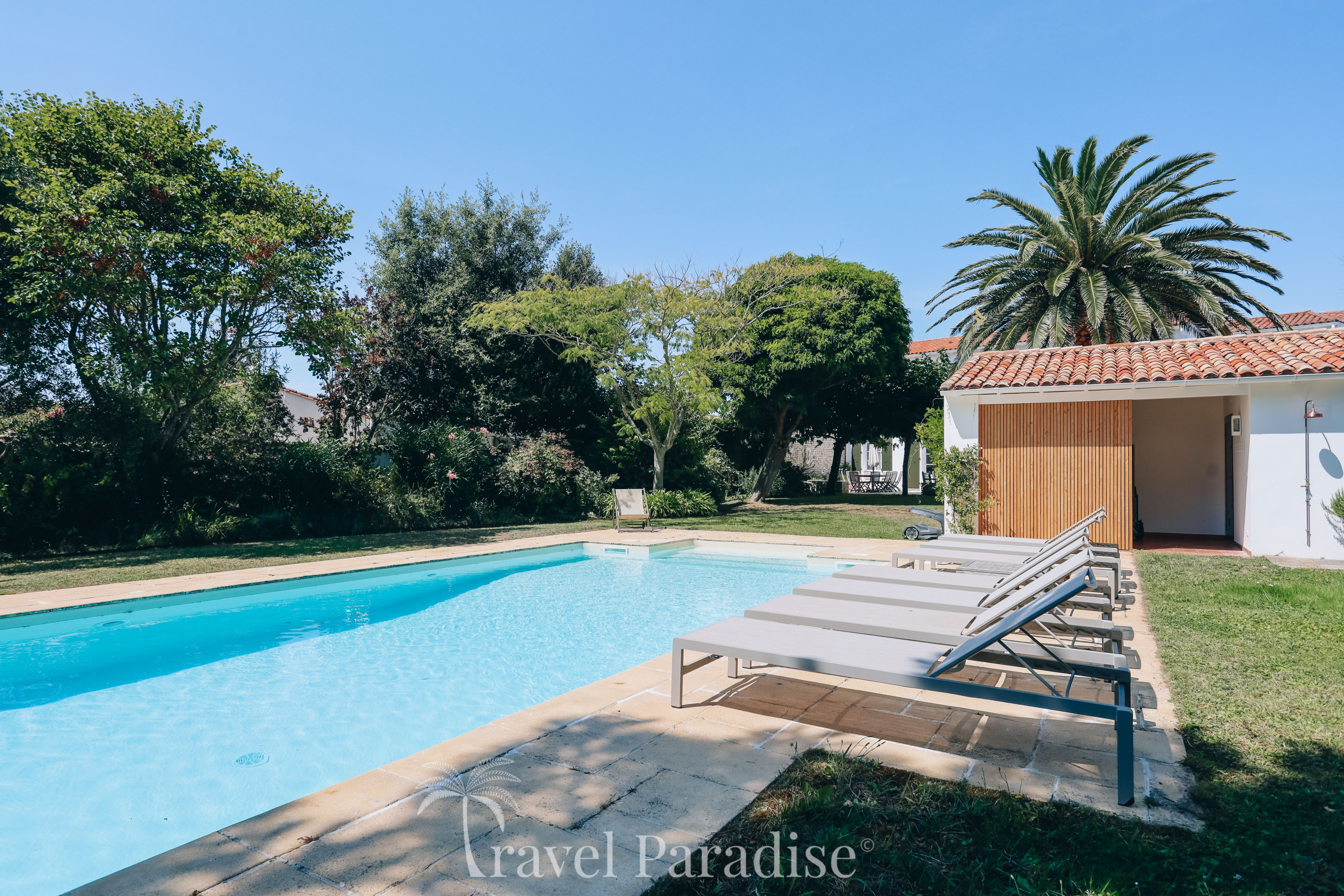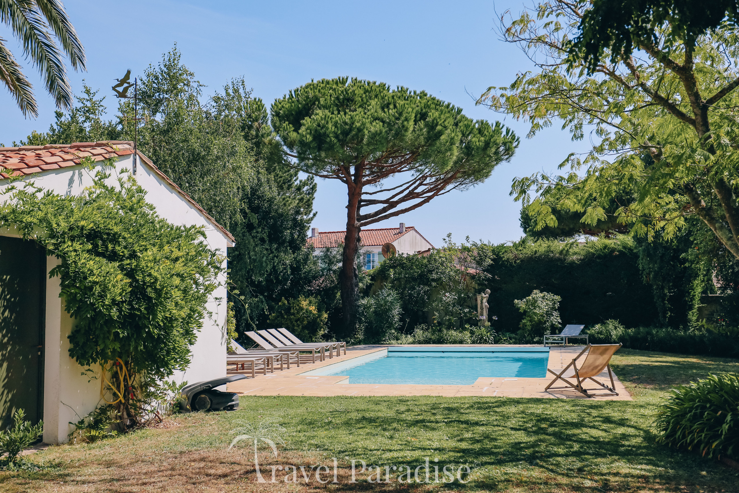 La propriété dispose d’une grande piscine chauffée, entourée d’un vaste jardin paysager qui invite à la détente sous le soleil rétais.